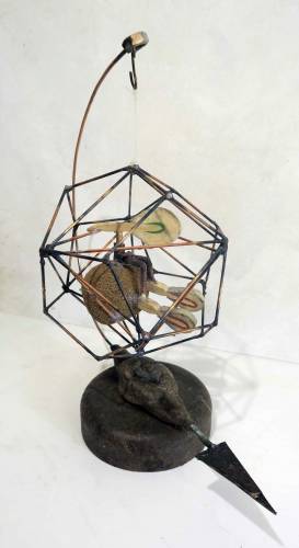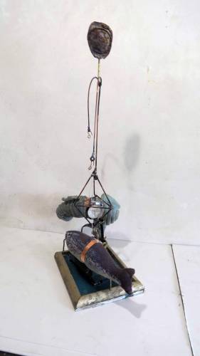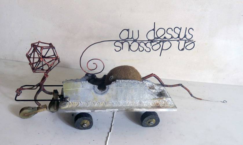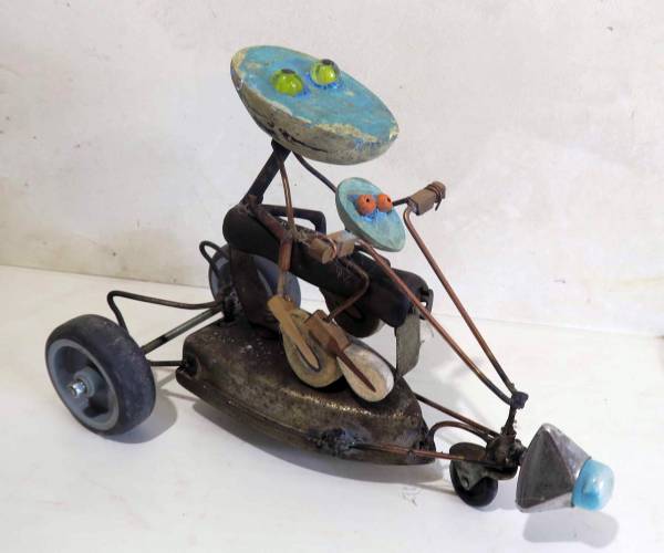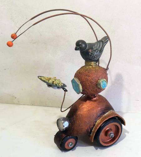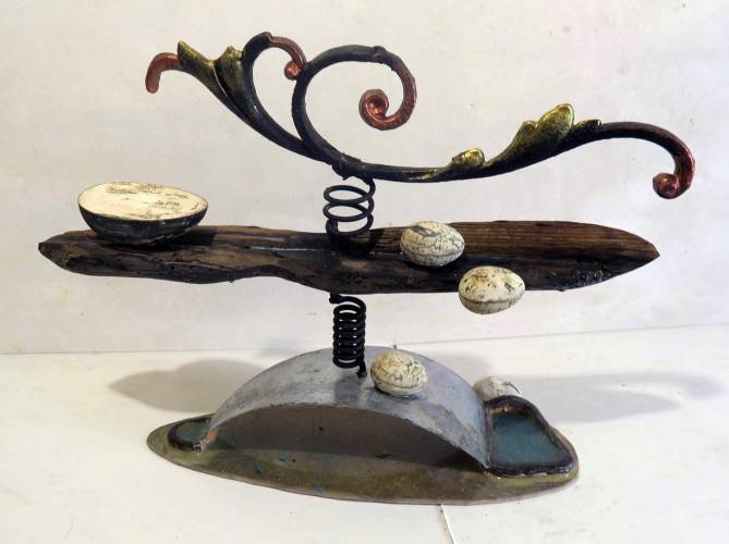 To play on words as I often do. In sculpture, and in linguistic terms. Often small sized creations, that attend particularly to irony, to the unexpected. A pleasure to gather little pieces of recycling, work on them, join them. Love of poetry.